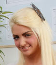 Blonde babe Chloe Westland strips from her office attire and shows her sexy body in her bra panties furthering her strip showing her wet panties and spreading her shaved pussy